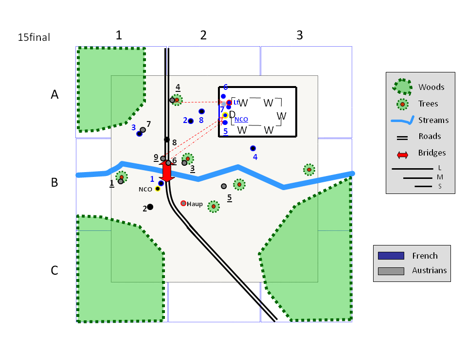 | It is almost dawn of October 10. Hauptmann Babbel is leading a forlorn hope from the 7th Austrian Jaeger Battalion to assault the bridge over the Wethau stream, a strategic post guarded by a squad of French voltigeurs. | |